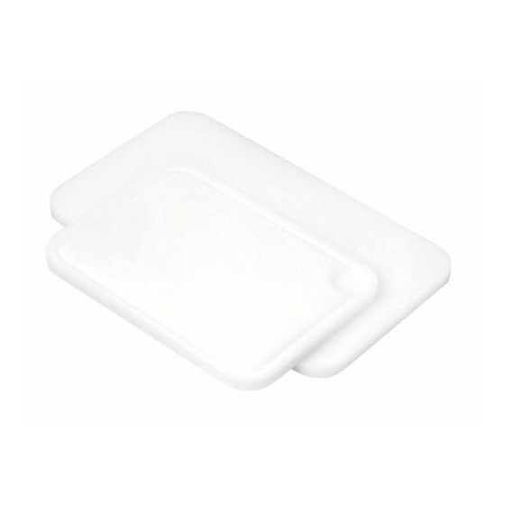 Planche de découpe rectangulaire blanche en polyéthylène haute densité avec coins arrondis, rigole d'écoulement, pieds silicone anti-dérapants.