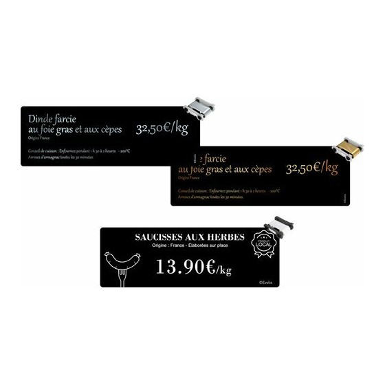 Le format 15 x 5 cm permet de structurer l’affichage des prix et des informations réglementaires. Il correspond notamment aux exigences françaises pour l’affichage du prix du pain et convient aussi aux menus traiteur ou plateaux de fromages. Les cartes sont fines et flexibles, ce qui facilite leur insertion dans les réglettes si nécessaire. Pour préserver la qualité d’impression, il est recommandé de manipuler les cartes par la tranche et d’éviter les surfaces abrasives. Les cartes peuvent être utilisées jusqu’à 2 à 3 ans après l’achat si elles sont stockées dans un environnement sec et frais.