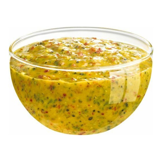 Couleur : Jaune avec marquants de poivron rouge, graines de moutarde, oignon, cerfeuil.