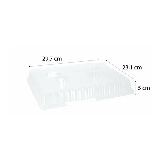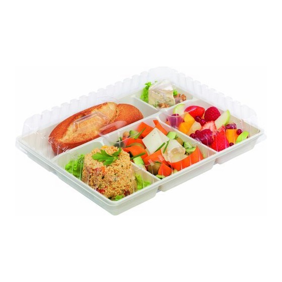 Ce couvercle transparent en PLA est spécialement conçu pour s’adapter au plateau repas 5 compartiments format 29 x 22,4 cm.