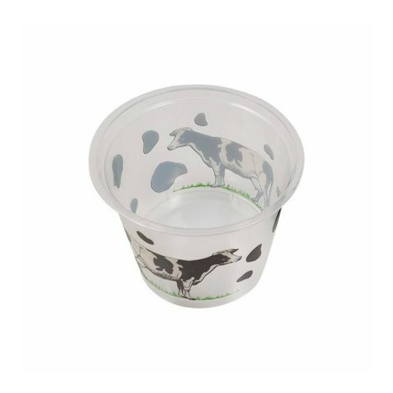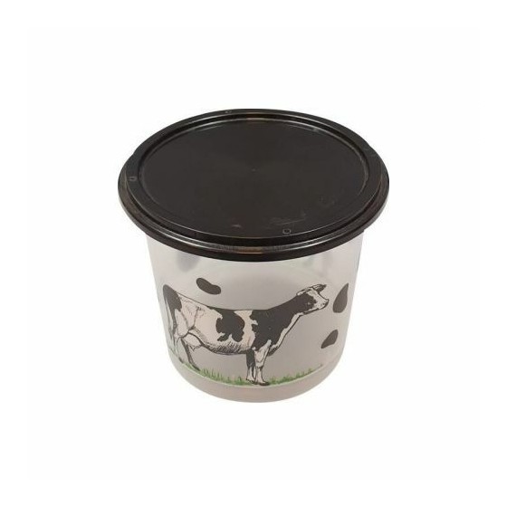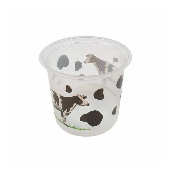 Pot en plastique avec décor vache et couvercle.
