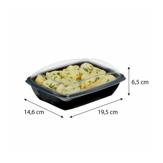 Polypropylène. Fond noir et couvercle transparent. Micro ondable. Pq de 30.