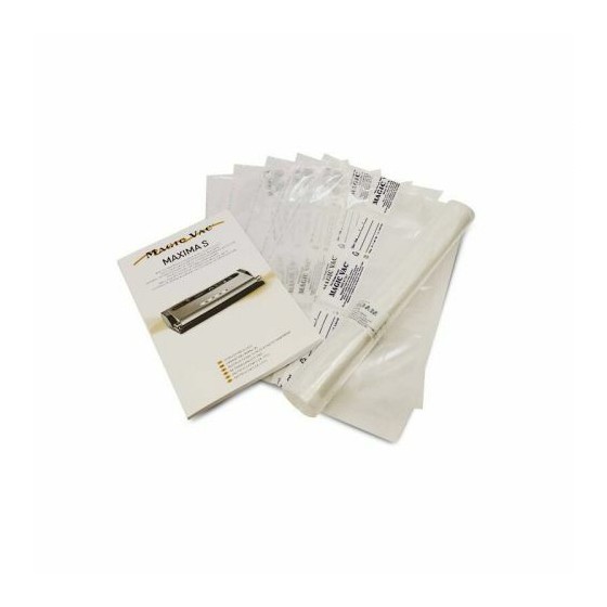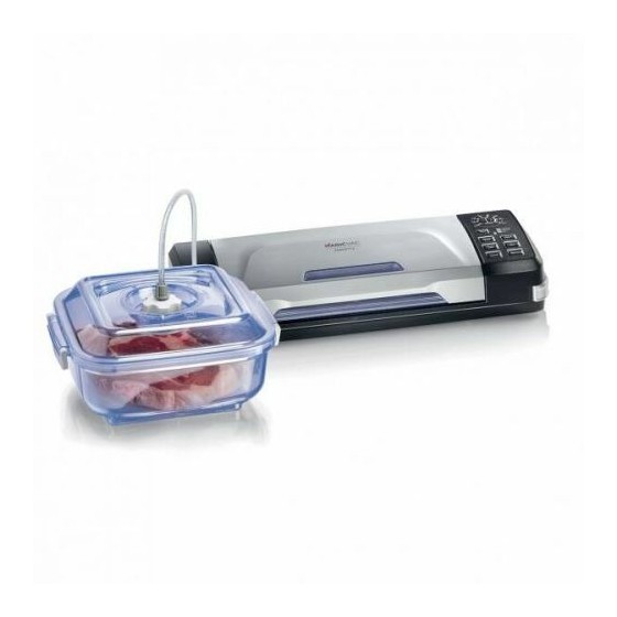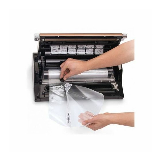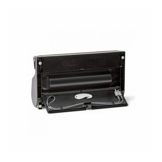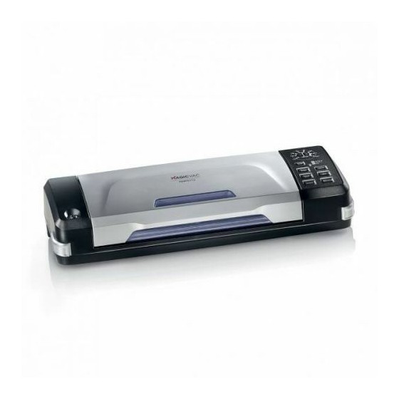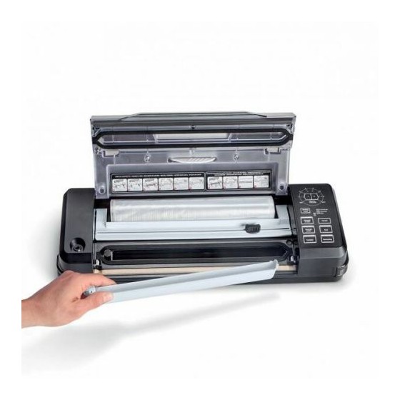 Machine à emballer sous vide livrée avec 1 rouleau 30 x 300 cm, 5 sacs pré-découpés 20 x 30 cm, 1 tuyau (pour utilisation avec récipients), 1 coupe-sac (logé à l’intérieur du couvercle).
