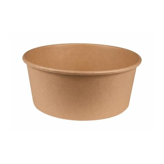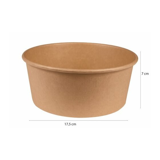 Avec son diamètre de 17,5 cm et sa hauteur de 7 cm, ce bol permet de charger généreusement sans débordement. Le carton kraft double épaisseur assure une bonne rigidité et conserve sa tenue même lorsque le bol est rempli.