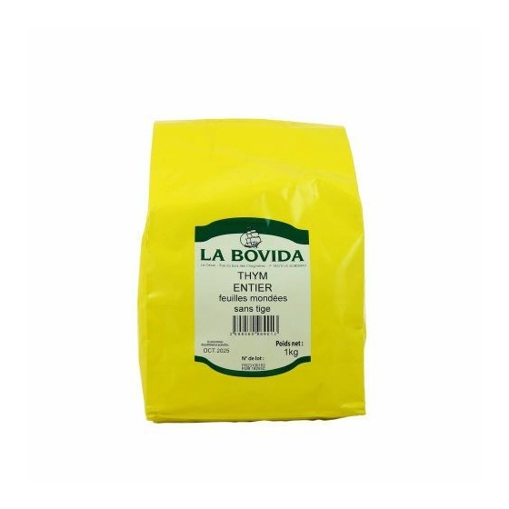 Composée de feuilles séchées entières. Issue de la plante herbacée vivace Thymus vulgaris sous forme mondée (les feuilles doivent être du reste de la plante), de la famille des Lamiaceae.