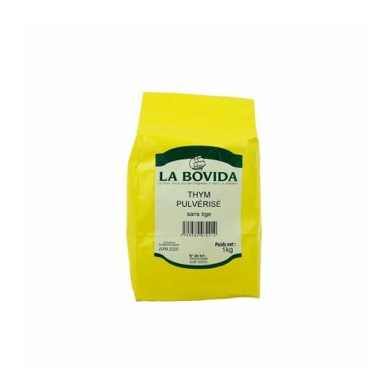 Composée de feuilles séchées réduites en poudre. Issue de la plante herbacée vivace Thymus vulgaris sous forme mondée (les feuilles doivent être du reste de la plante), de la famille des Lamiaceae.