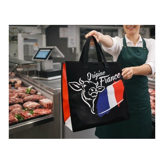 Ce sac cabas boucherie en polypropylène non tissé est conçu pour accompagner vos ventes tout en renforçant votre image professionnelle. Son visuel bleu blanc rouge associé au motif « Origine France » met en avant le savoir-faire artisanal et la qualité des produits proposés en boucherie.