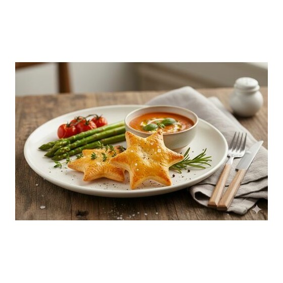 Petite et dorée à souhait, la mini étoile 6 branches feuilletée au beurre apporte une finition délicate et gourmande à vos assiettes et présentations traiteur. Idéale pour sublimer une entrée, un plat chaud ou une cassolette.
