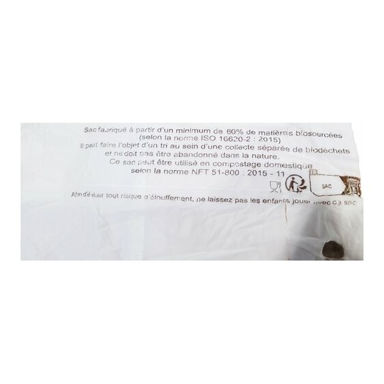 Sac pour emballage primaire conforme à la législation applicable au 01er janvier 2017. 100% biodégradable et compostable conforme à la loi n°2015-992 du 17 août 2015. Compostage domestique conforme à la norme NF T 51-800.