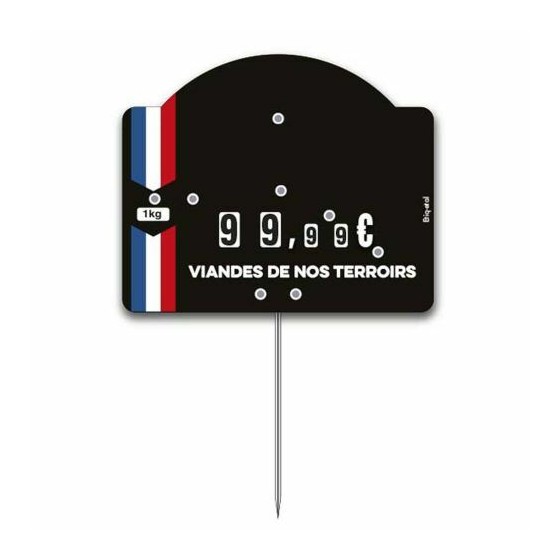 Cette étiquette prix à pique et à tournette est conçue pour valoriser clairement l’origine régionale des viandes en vitrine. Son décor bleu blanc rouge avec la mention « Viandes de nos terroirs » attire immédiatement l’attention du client. Elle permet un affichage lisible du prix et des quantités, tout en renforçant la perception de qualité des produits. Un support fiable et durable, pensé pour les exigences quotidiennes des boucheries et commerces alimentaires.