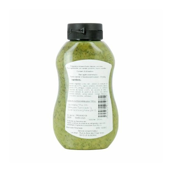 Ingrédients : Huiles végétales (colza, sal), Epices et plantes aromatiques (ail, oignon, échalote, poivre blanc, ciboulette, poivre noir, aneth, persil, estragon, romarin), sel, arômes naturels de beurre (LAIT), de curcuma, de citron et d'ail, arome naturel de persil et autres arômes naturels, vinaigre d'alcool, concentré de spiruline et carthame.