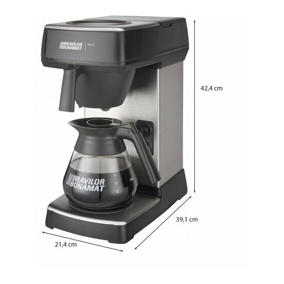 La conception robuste et les dispositifs de sécurité intégrés garantissent une utilisation quotidienne fiable. Grâce à son entretien aisé et à ses voyants de contrôle, la Novo limite les interruptions de service et s’intègre durablement dans les espaces professionnels recherchant une cafetière filtre performante et accessible.