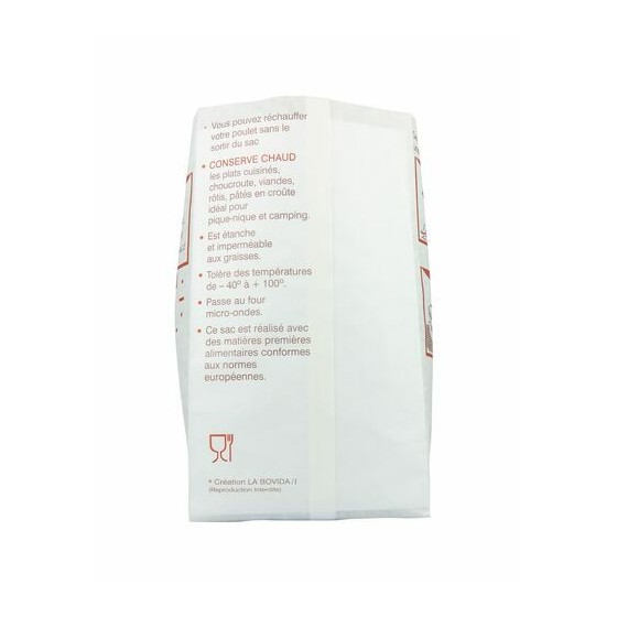 Utilisez le sac poulet rôtisserie directement après la cuisson. Pour réchauffer le produit, placez-le au four doux pendant environ 10 minutes sans dépasser 100°C. Conservez-le dans un endroit propre et sec afin de préserver son étanchéité et sa résistance aux graisses.