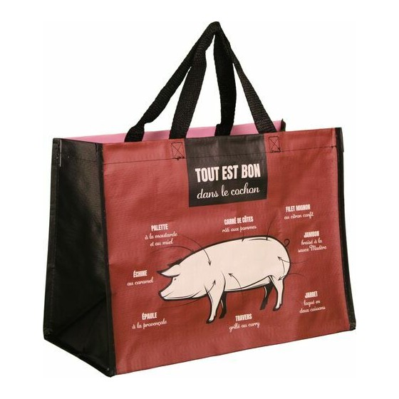 Le sac cabas "Charcuterie" en polypropylène tissé est conçu pour accompagner les ventes en boutique. Son visuel met en avant les différentes pièces du cochon et valorise le travail de transformation artisanale.