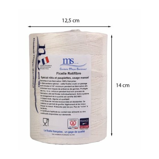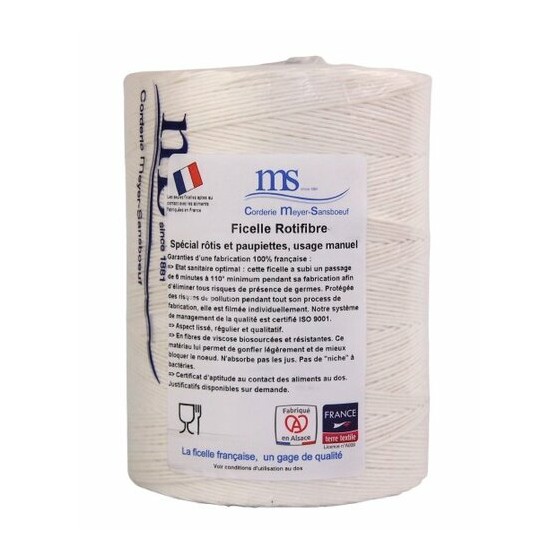 La ficelle de cuisson Rotifibre viscose 2TE blanche en bobine de 1 kg est conçue pour le ficelage des viandes et poissons destinés à la cuisson. Fabriquée en France, elle répond aux exigences sanitaires et techniques des métiers de bouche. Sa structure en viscose biosourcée assure une excellente tenue du nœud sans marquer excessivement le produit. Elle est parfaitement adaptée aux usages en boucherie et charcuterie artisanale.