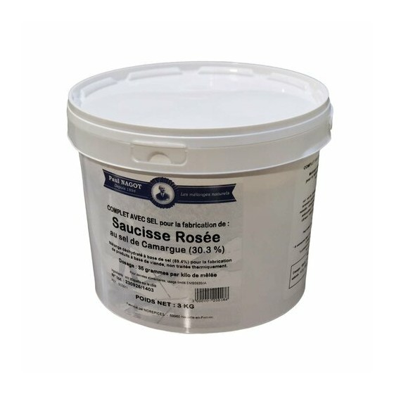 Le complet saucisse rosée au sel de Camargue Paul Nagot est un mélange d'assaisonnement destiné à la fabrication de saucisses à base de viande. Sa formulation associe sel, épices et aromates afin d'apporter un goût équilibré et une coloration rosée caractéristique aux préparations.