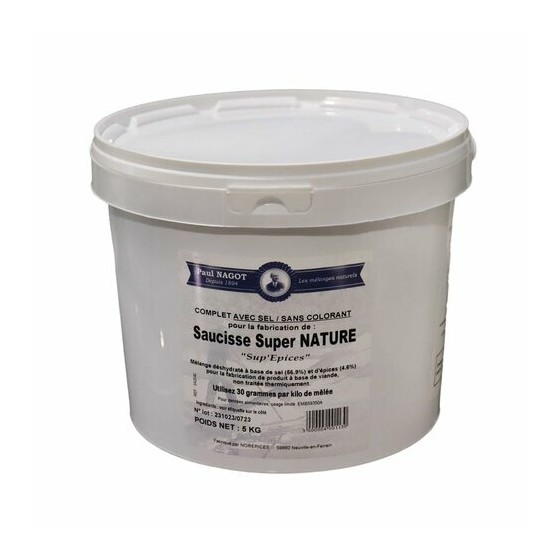 Le complet saucisse Super Nature permet de simplifier l'assaisonnement des préparations destinées à la fabrication de saucisses. La présence de sel et d'épices contribue à obtenir une préparation homogène et régulière dans la mêlée.
