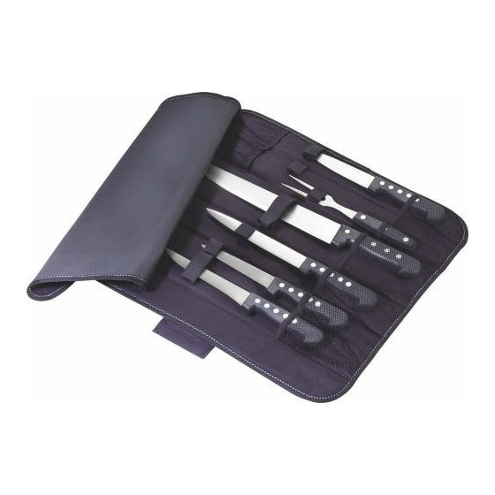 Cette magnifique trousse de cuisine contient 5 couteaux et une fourchette, indispensable pour les étudiants en boucherie ou en école hôtelière.