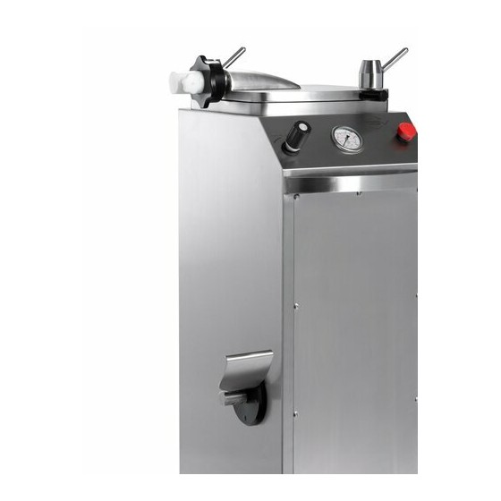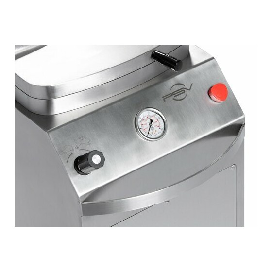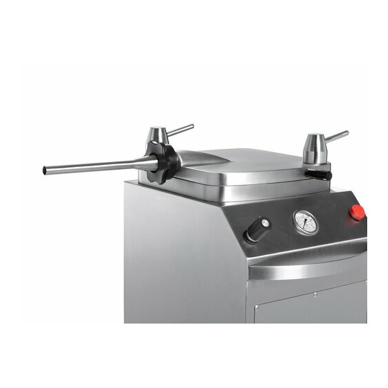 Le couvercle en acier inoxydable à double serrage, associé à un joint torique, assure une parfaite étanchéité et empêche toute fuite de chair lors de l’embossage. Le piston inox démontable offre une étanchéité optimale et facilite le nettoyage. La pression, réglable selon les besoins, est contrôlée avec précision grâce à un manomètre.