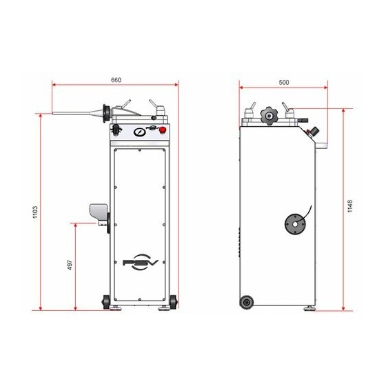 Travailler la chair à une température minimale de 10 °C. Avant chaque utilisation, positionner le piston en bas et huiler le cylindre. Vérifier le bon serrage des deux verrous du couvercle avant démarrage. Utiliser la commande fémorale pour garder les mains libres pendant l’embossage. Installer la machine sur une surface plane, stable et horizontale.