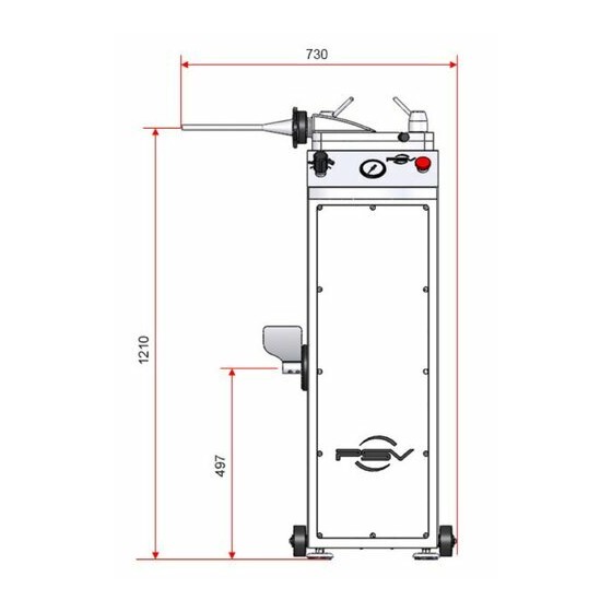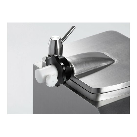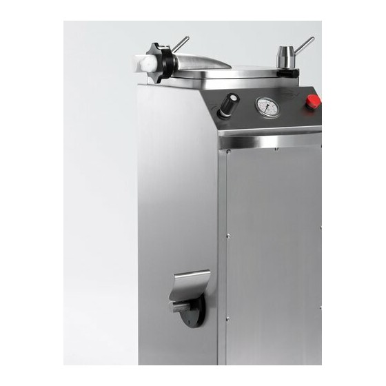 L’ouverture frontale offre un large accès pour les opérations de maintenance. L’évacuation directe de l’eau de rinçage facilite l’entretien en fin de production. La fonction start and stop au genou améliore l’ergonomie et libère les mains lors du travail. Trois cornets en inox sont fournis de série pour s’adapter aux différents calibres.