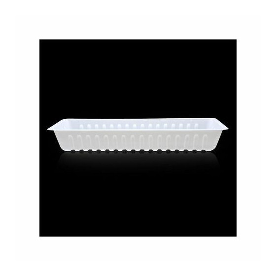 Barquette charcutière 91 cl en polystyrène blanc, à fond et parois ondulés.